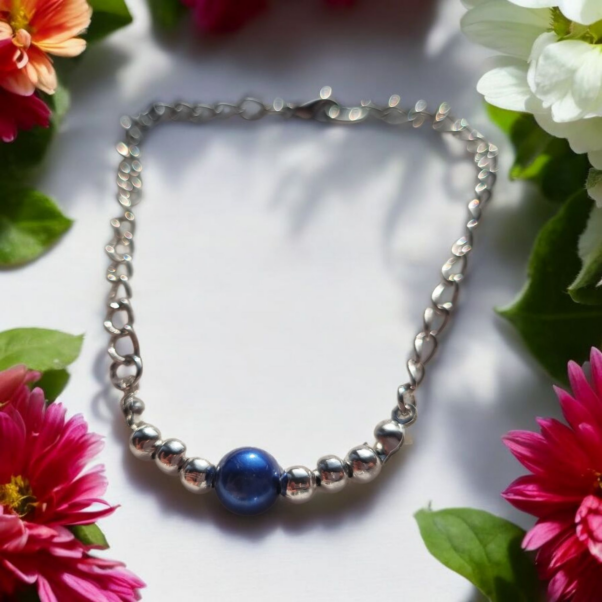 Hand designed by Ben. This bracelet main focus is the blue pearl with silver finishing.
