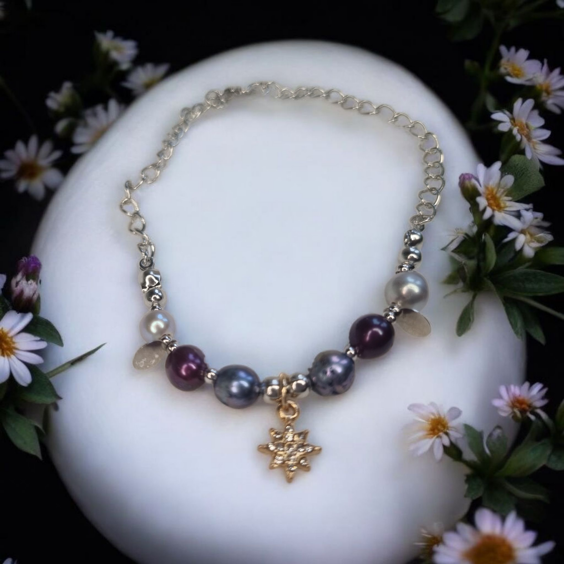 Hand designed by myself. This "midnight" bracelet was inspired by the night sky. It has silver, purple and dark blue pearls and a golden star charm and silver finishings.