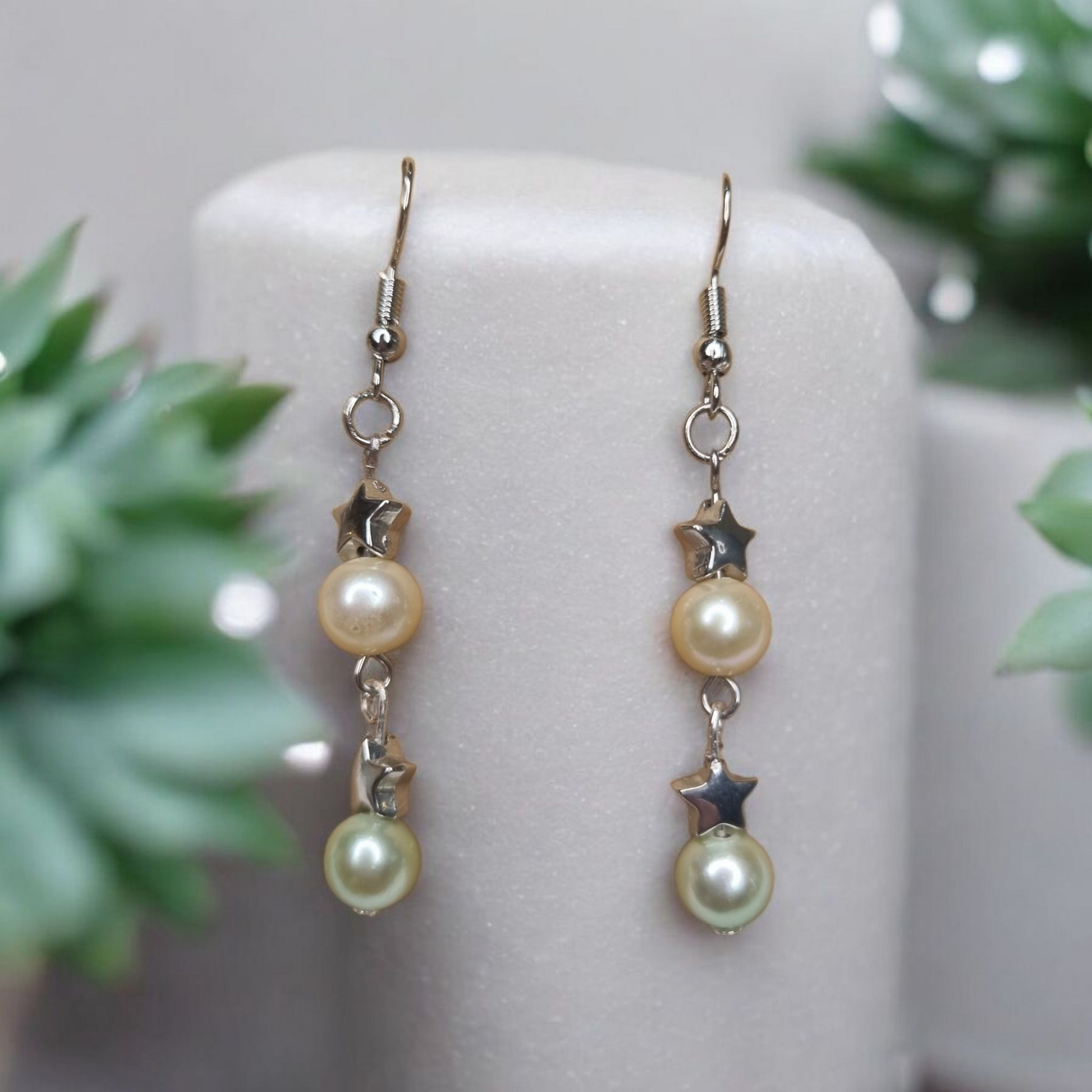They are silver-plated material. Mounted with silver coloured stars and freshwater pearls - a green and cream.