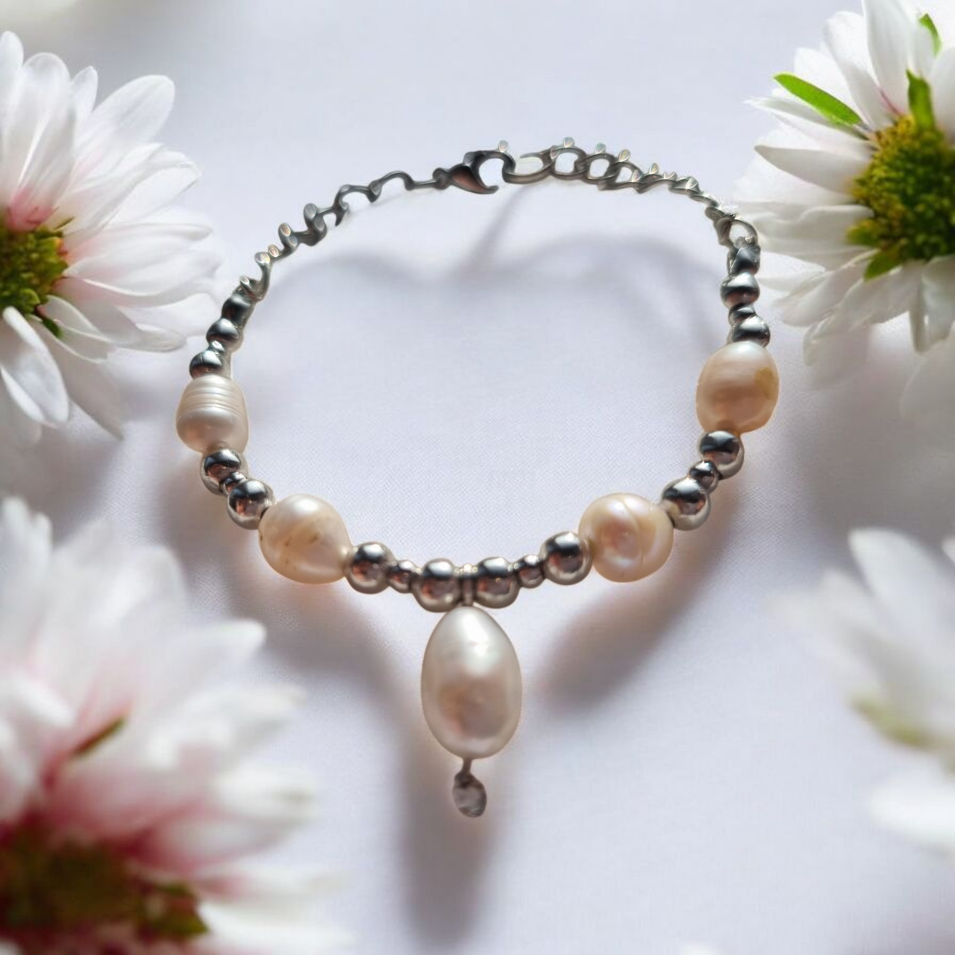 Hand designed by myself. This bracelet has 5 freshwater natural cream/white pearls and silver finishings.