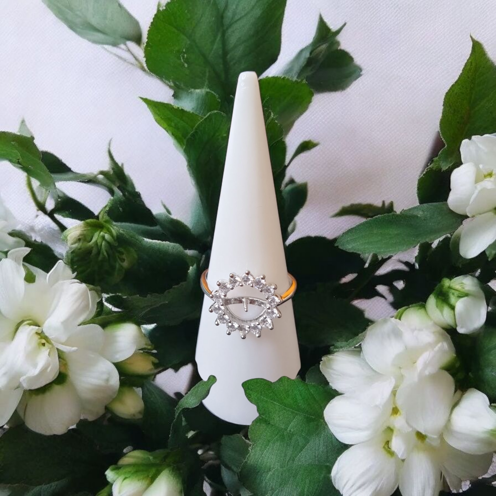 This is solid sterling silver, rhodium plated with cubic zirconia stones. This is fully adjustable in the back. This ring will come with a round oyster opening.