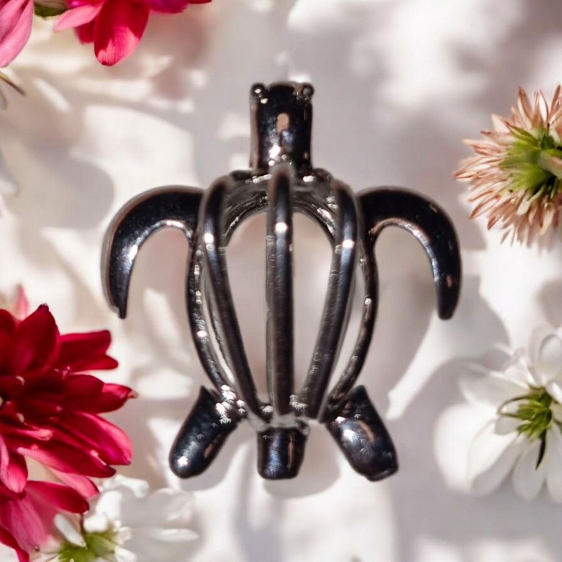 Silver-plated turtle cage. This will come with a silver plated chain and an oyster opening.