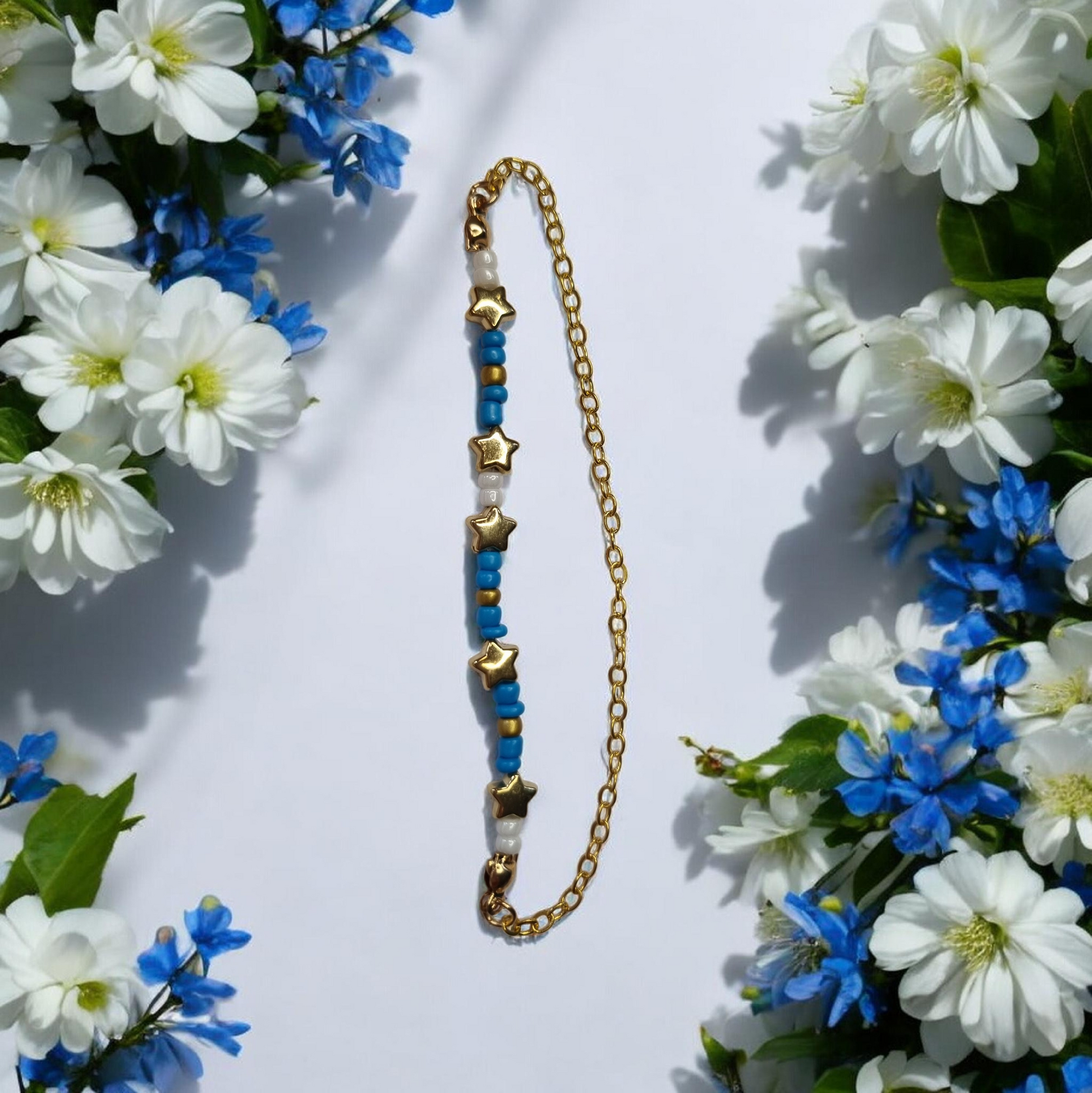 Mixed coloured beads and gold stars on an elastic string with gold plated chain. And designed by Little A.