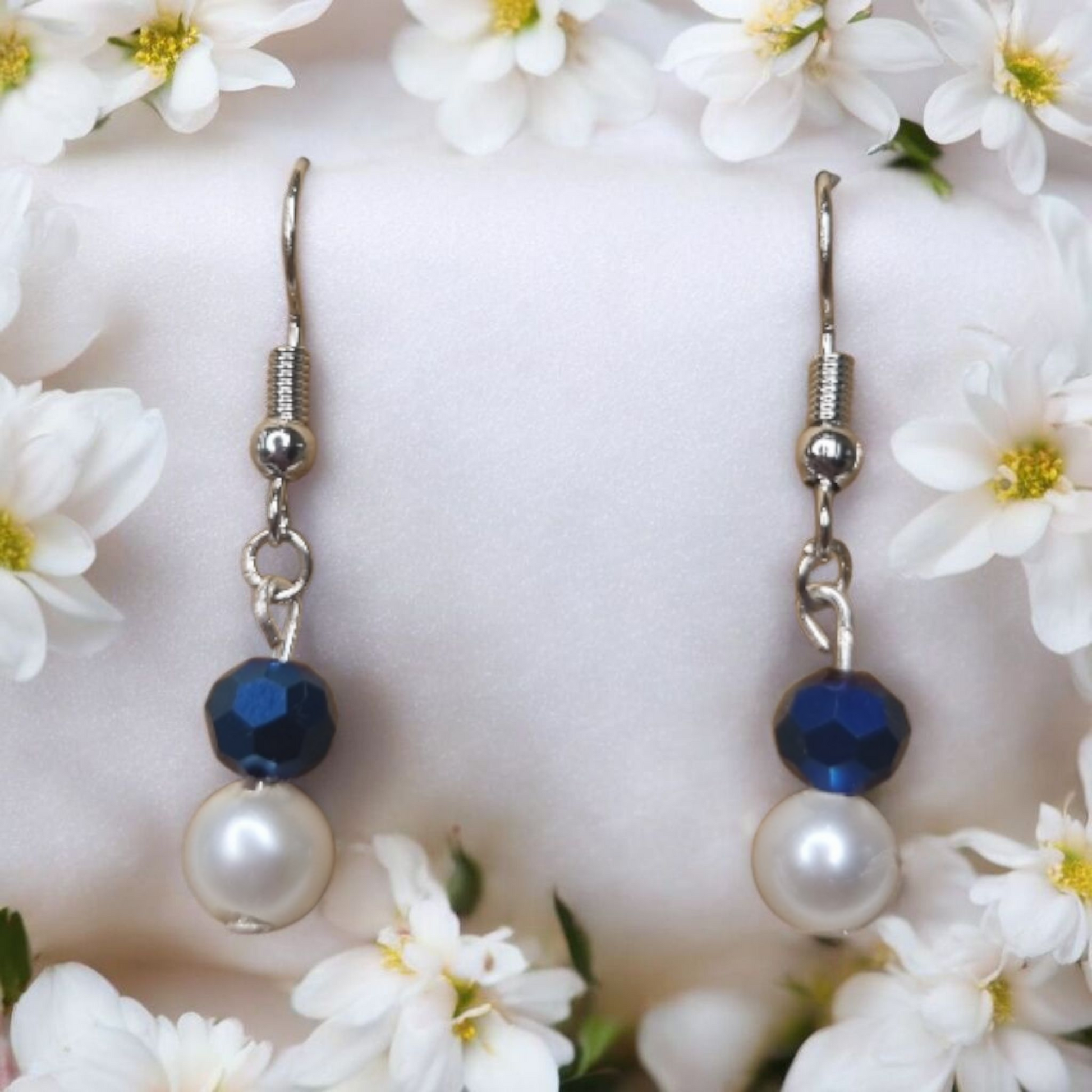 They are silver-plated material with a white freshwater pearl and a blue bead.