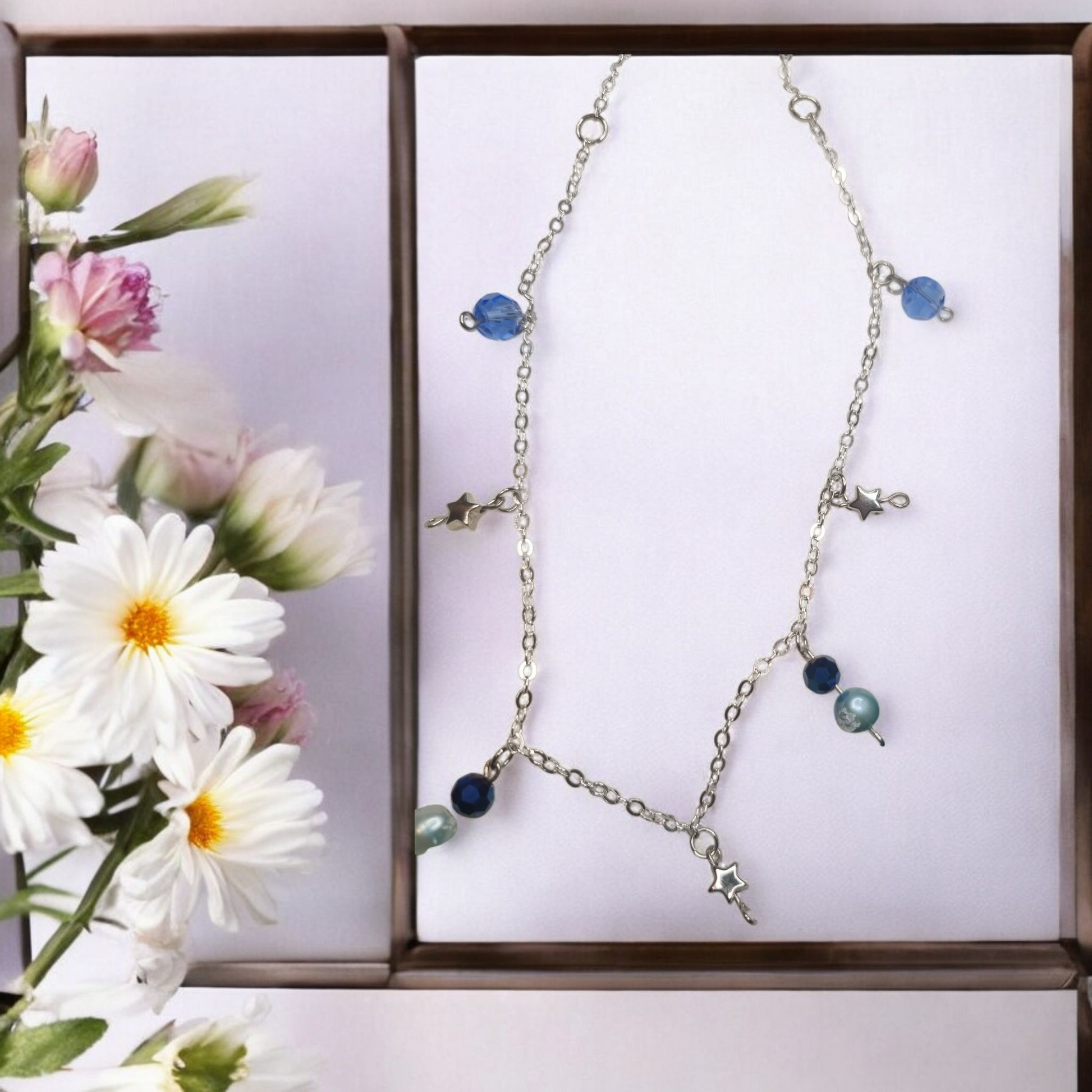 These necklace has been crafted with silver-plated chain and clasps. It is mounted with blue beads and silver coloured stars. It also have two light blue freshwater pearls.